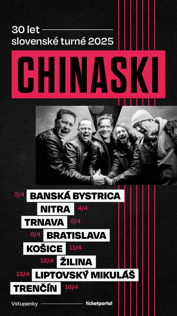 Legendárna česká skupina CHINASKI oslavuje 30 rokov na scéne a už tento týždeň vyráža na slovenské turné! K narodeninám si darovala nový album s názvom 30 a nový song a klip Slyším tvoje kroky, ktorý bodoval na prvom mieste v ankete Žebřík. V obľúbenej ankete získali CHINASKI aj ďalšie ceny v kategórii kapela roka a akcia roka!